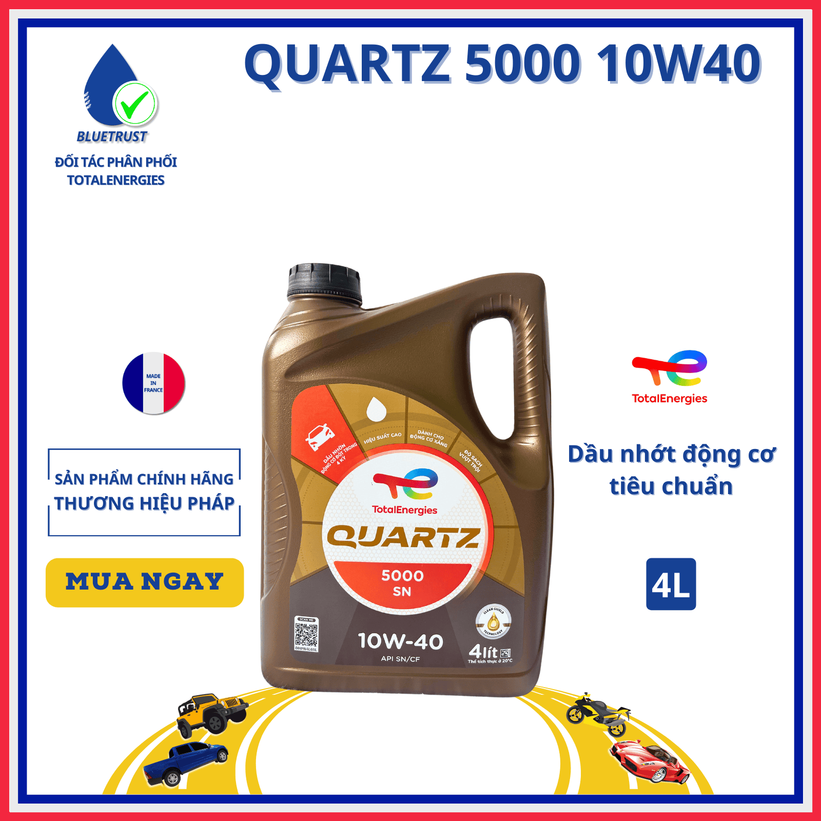 Dầu động cơ ô tô TOTAL QUARTZ 5000 SN 10W40 là dầu nhờn đa cấp hiệu suất cao cho xe hơi, được thiết kế vượt các yêu cầu bôi trơn động cơ hiện đại cho các dầu động cơ khoáng.