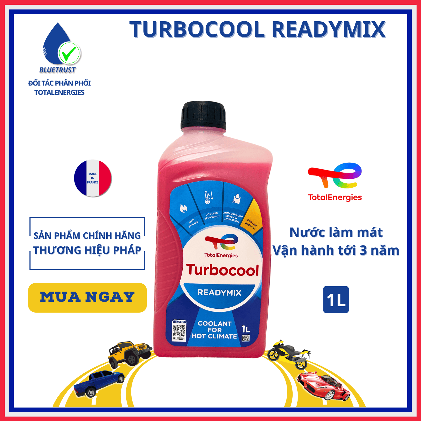 Nước làm mát TOTAL TURBOCOOL READYMIX Không chứa các chất Phốt-phát, Ni-trít, A-min và Bo-rắc.